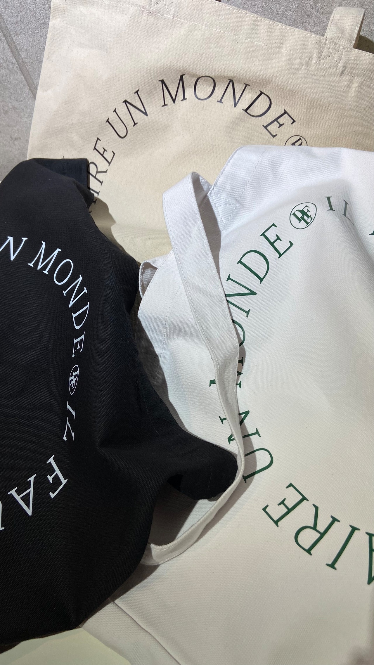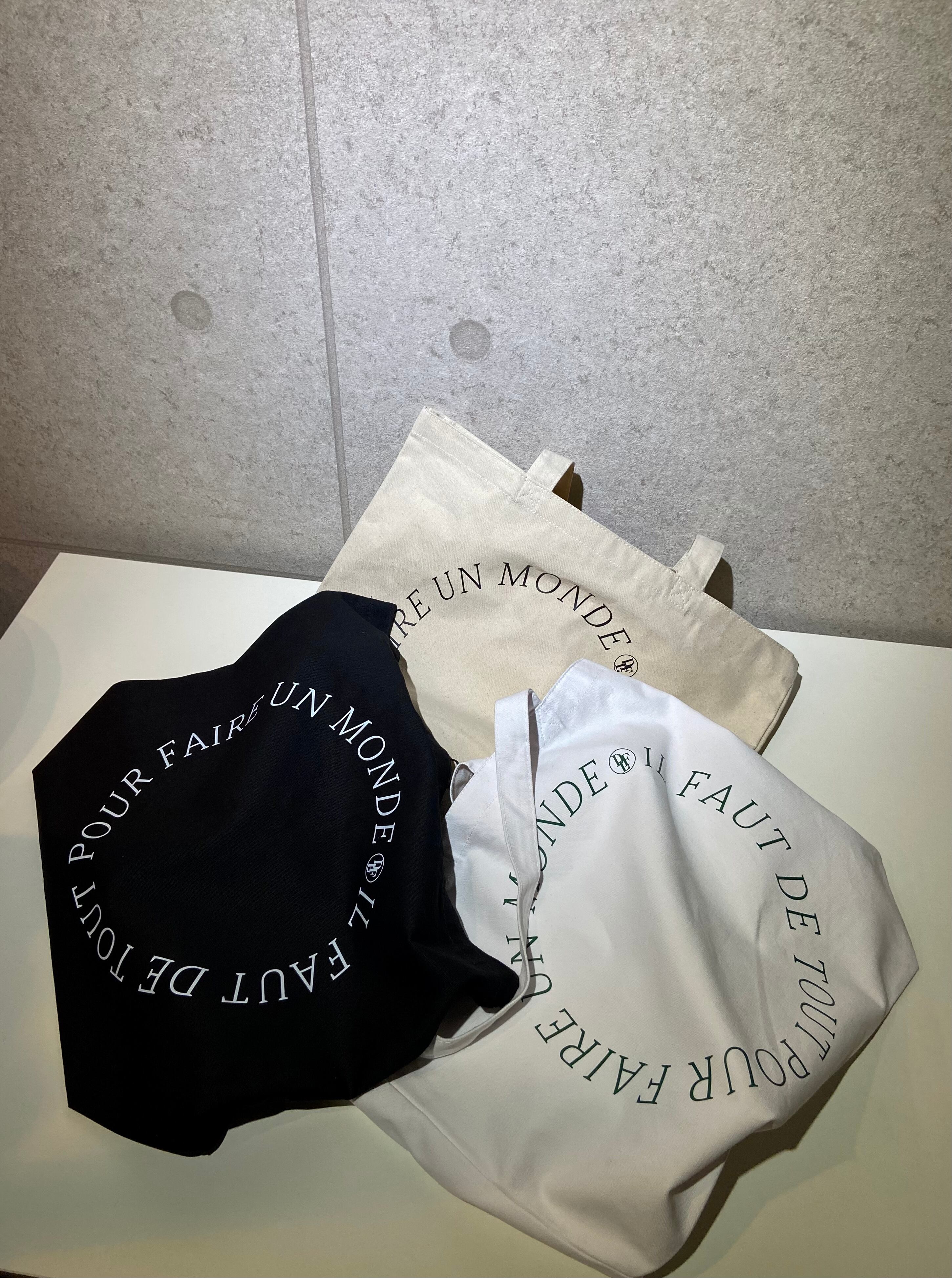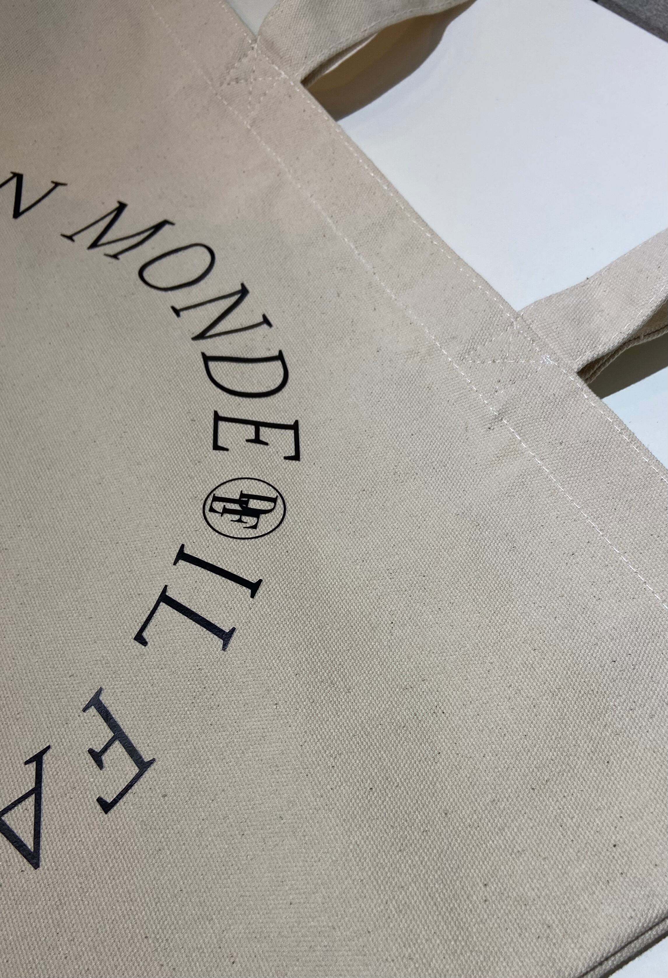 ナチュラルカラーの生地にブラックのロゴがシンプルで